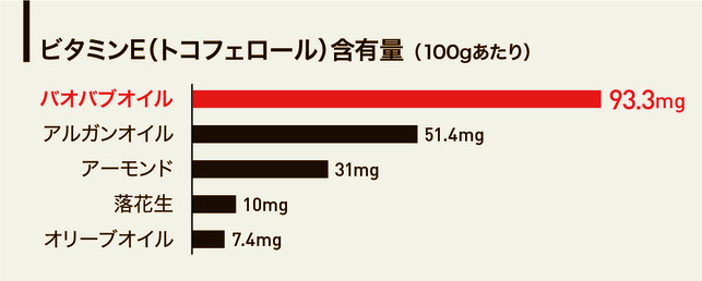 バオバブ・サンライズが仕入れるマラウィ産のバオバブオイルは、エイジングケアに適しているビタミンE(トコフェロール)を100g中93mg含み、保湿効果が高い成分分析の結果を得ています。この含有量は、一般的に市販されているアルガンオイルの約2倍、オリーブオイルの10倍以上の含有量で、抜群に豊富であると言えます。